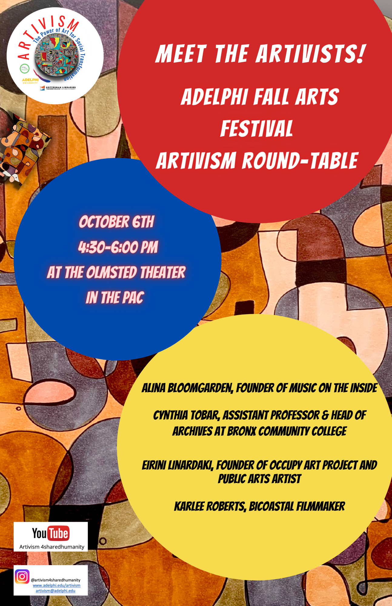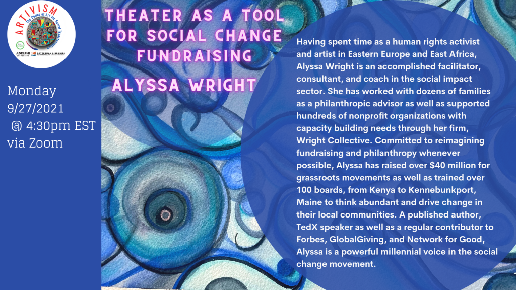 Our current season started this past September and will feature an amazing line-up of international presenters, spanning from locations such as Ecuador, Greece, Costa Rica, Russia, the Philippines, Iran, and France. In addition, we are also collaborating with Adelphi University’s “Fall Arts Festival” on October 6th, 2021, with a live roundtable discussion, held in the Olmsted Theater at Adelphi University’s Performing Arts Center. Adelphi students are also currently working on creating an official Artivism Club on campus. Our ongoing Student Ambassador Program continues to provide a platform for students to share their voices while also connecting directly with other artivists. This upcoming Spring 2022 season is all lined up and ready to ignite our audiences.