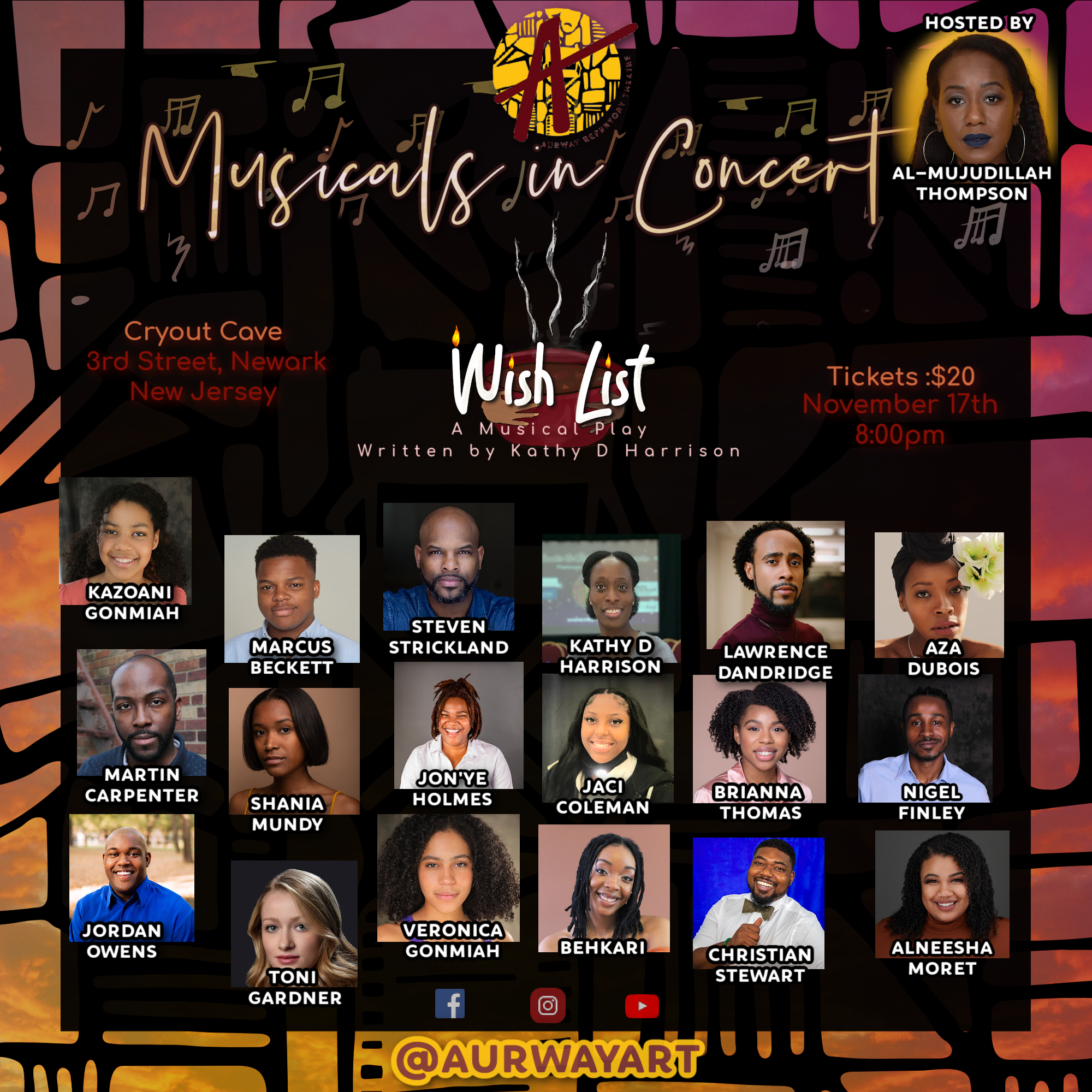This past season Aurway has been working our way back into the world with some live events. In September we were featured in the Newark Arts Festival with, “An Evening with Aurway”, where we performed a few of our favorite original Aurway tunes. In addition, we continued our concert series, “Musicals in Concert”, with a virtual presentation of our newest work Life Through My Eyes as well as a live presentation and reunion of Wishlist, an original work by playwright, Kathy D. Harrison. We also have a bi-monthly play reading series called, PlayTime, where we read and explore works by black and brown playwrights.