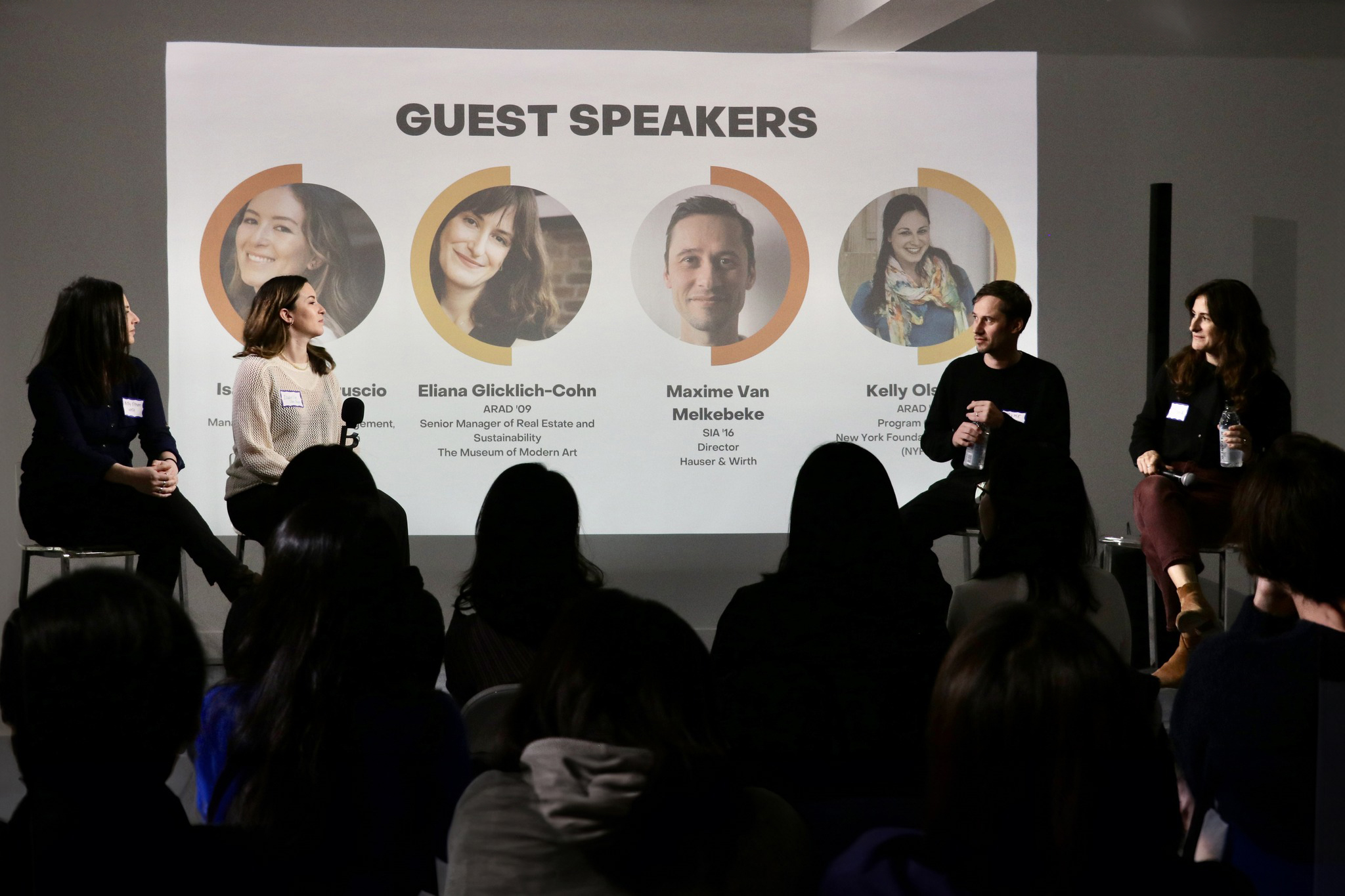 The roundtable featured distinguished alumni from Columbia University, New York University, and Sotheby’s Institute of Art, showcasing a panel of seasoned professionals in the arts industry. Esteemed guest speakers included Eliana Glicklich-Cohn (ARAD ’09, Senior Manager of Real Estate and Sustainability at The Museum of Modern Art), Kelly Olshan (ARAD ’17, Program Officer at the New York Foundation for the Arts), Isabella Caporuscio (VAA ’22, Manager of Academic Engagement at the Guggenheim Museum), and Maxime Van Melkebeke (SIA’16, Director at Hauser & Wirth). Their presence significantly contributed to bridging the gap between current students and industry veterans.